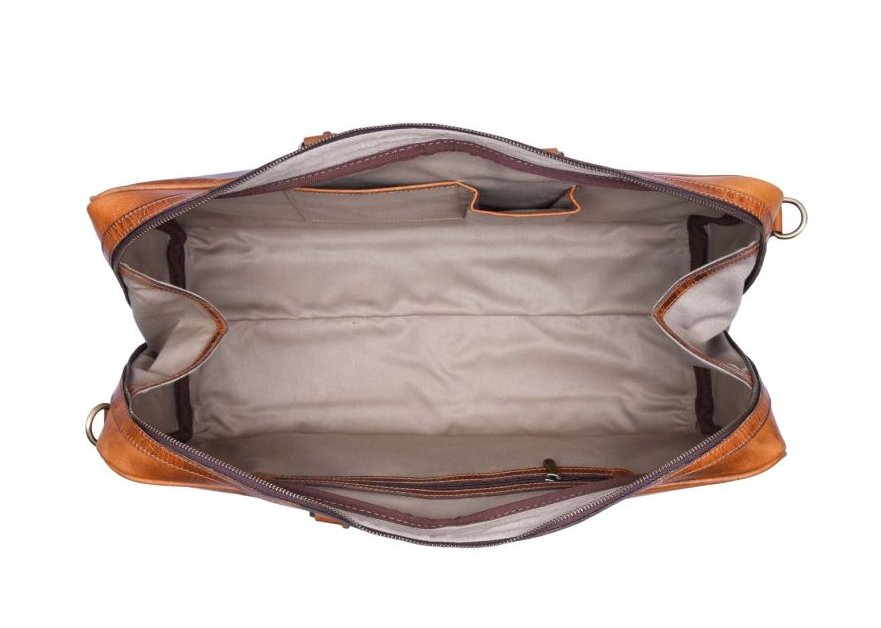 Indvendig finder man på den ene side, en større lynlåslomme. På den anden side finder man to mindre lommer til eksempelvis mobil og pung. Ydermere, har tasken er god åbning, som gør det nemt at pakke og pakke ud. I bunden er tasken udstyret med nitter. Med til tasken følger en lang justerbar skulderrem som ligeledes udført i samme type skind.