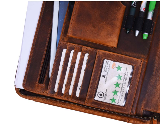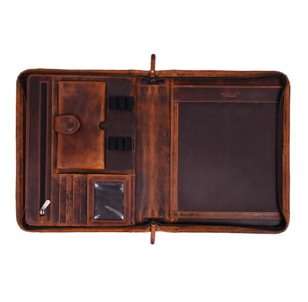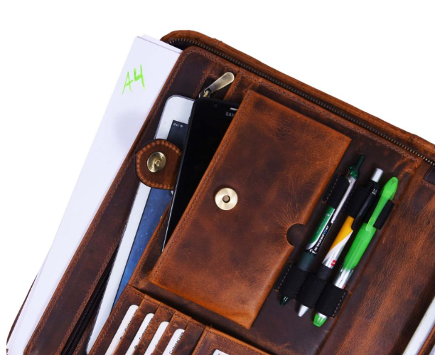 - On the other side of the internal compartment, the Travel Portfolio houses a Leather Organizer Slot which houses 4 card holders, ID Tag, USB Slots, 3 Pen Holders, Mobile Case, and a Zippered compartment for other essentials.