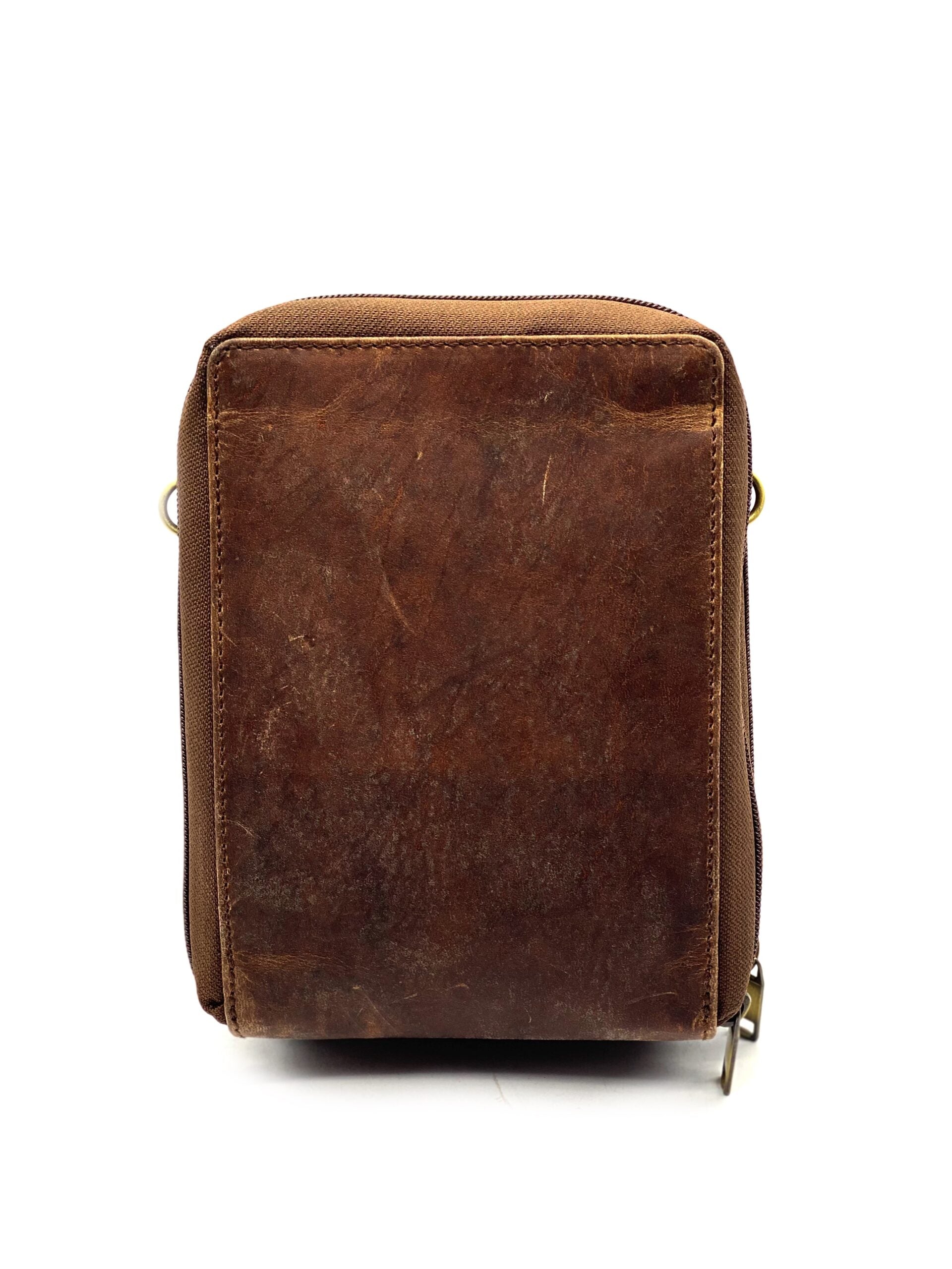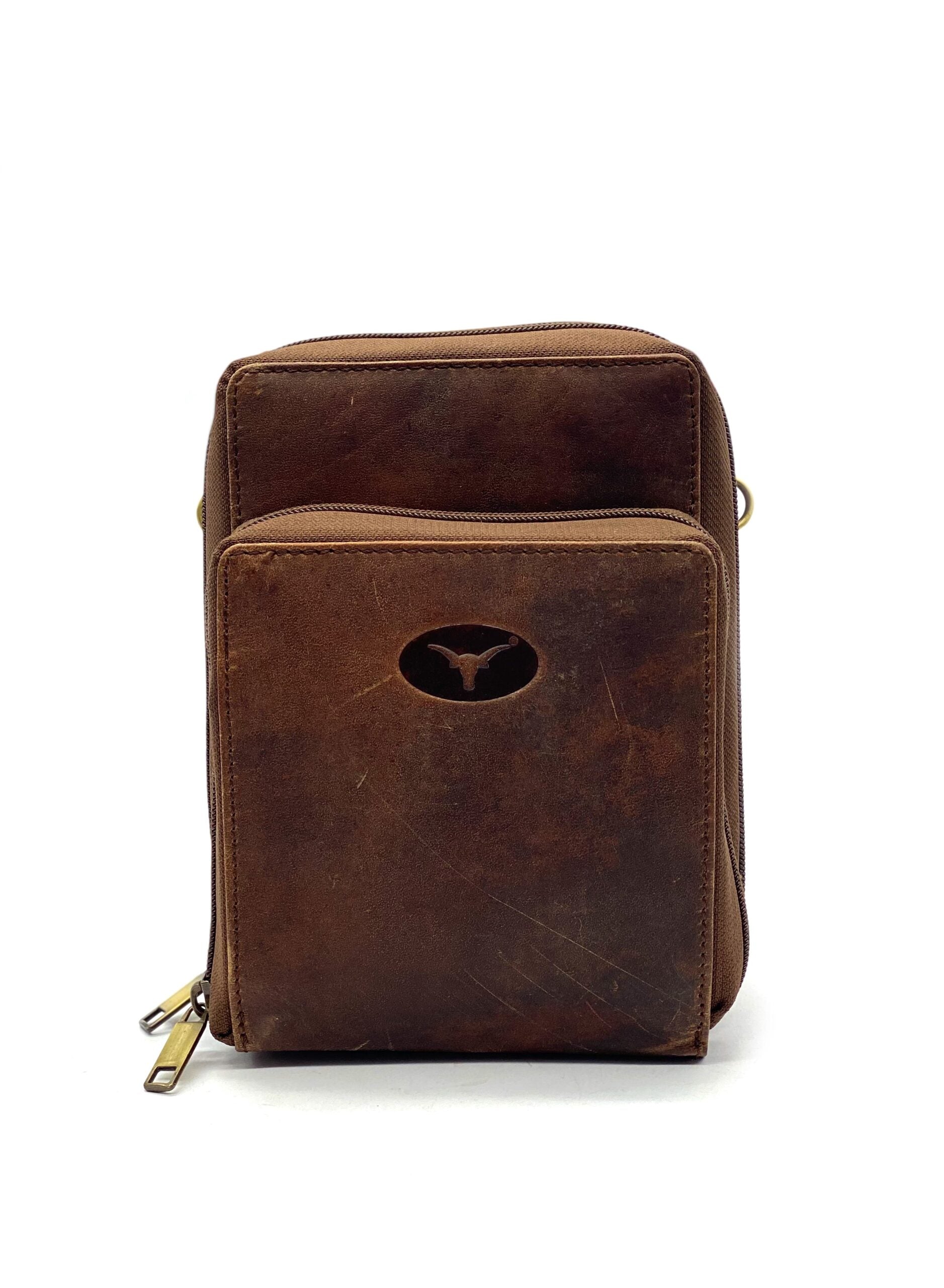 Med til tasken følger en kort rem til håndledet, samt en lang justerbar rem, som ligeledes er udført i bøffelskind.