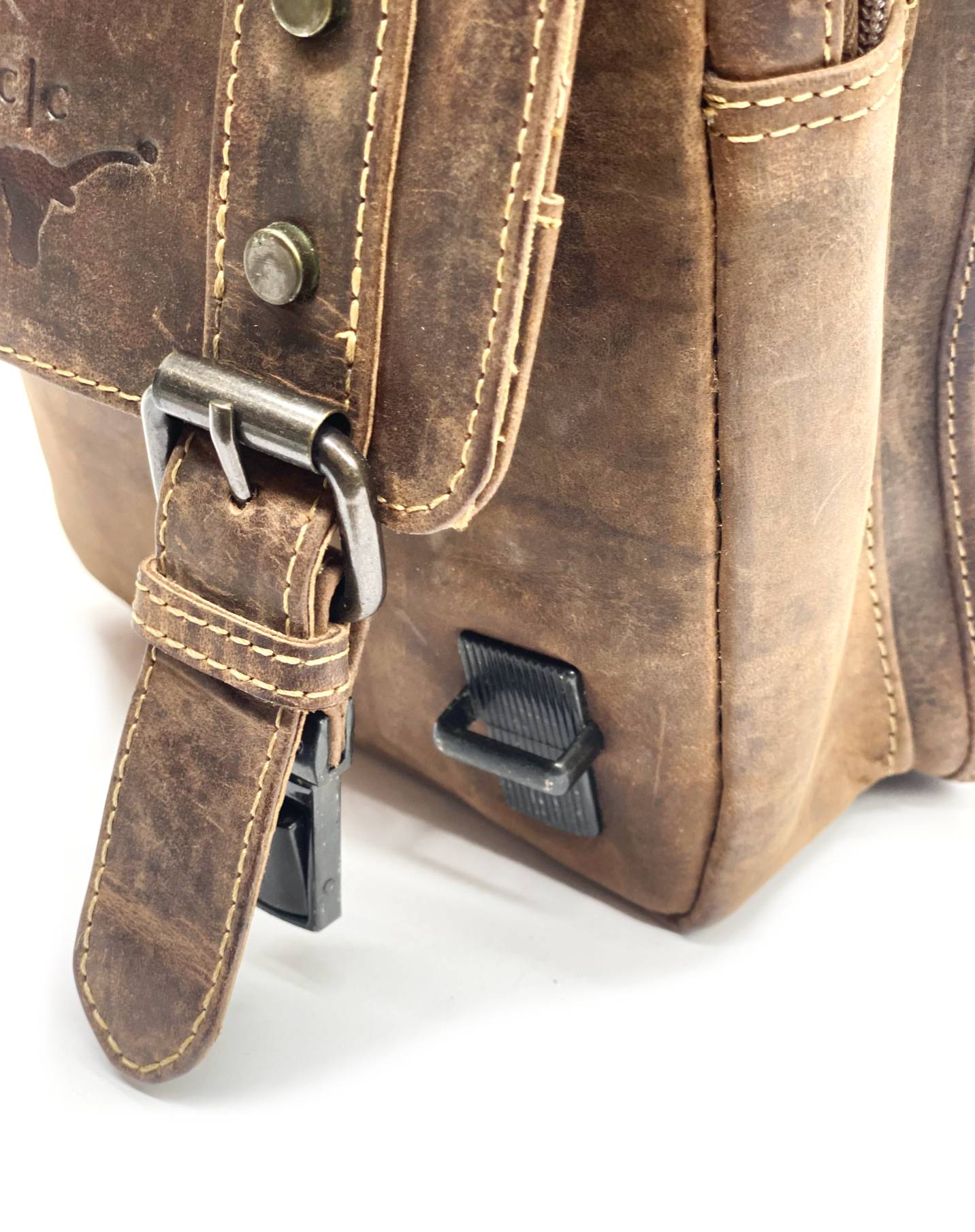 Remmene på tasken er udført i delvist bøffelskind på ydersiden og canvas på indersiden.