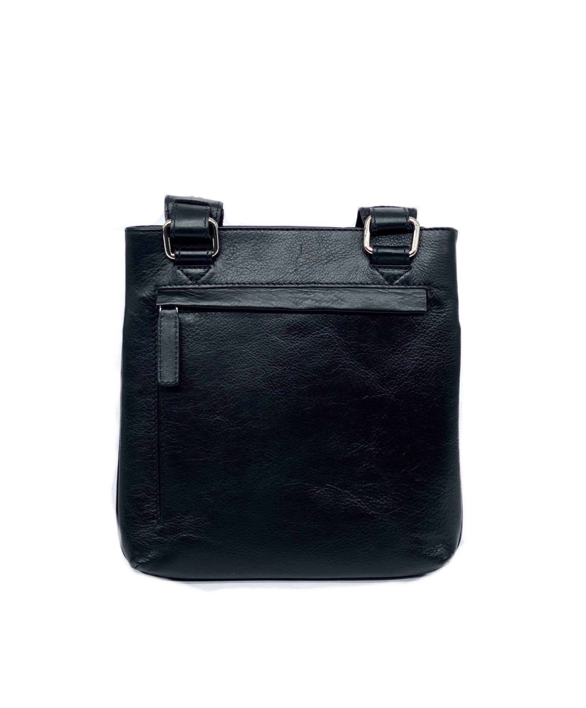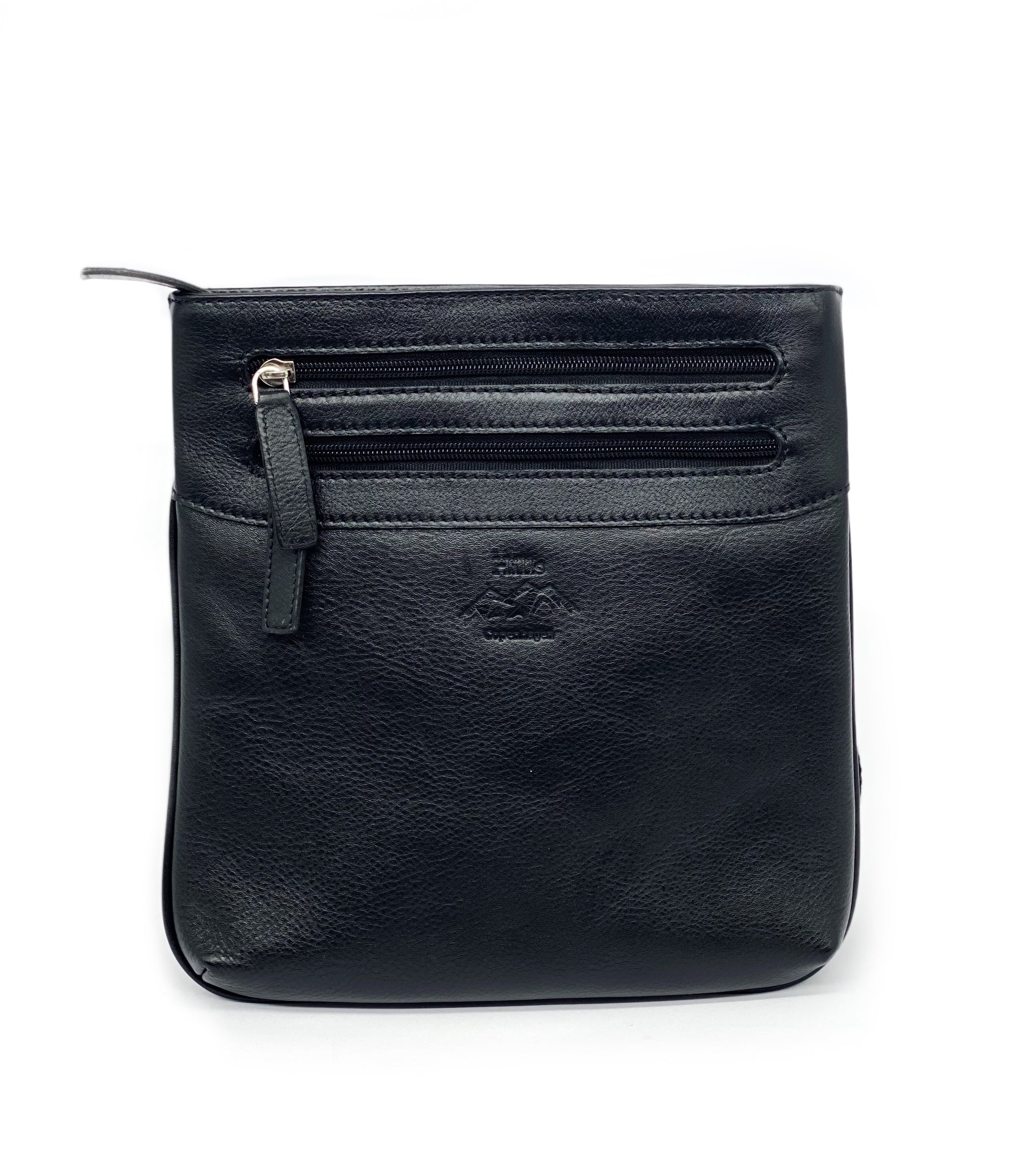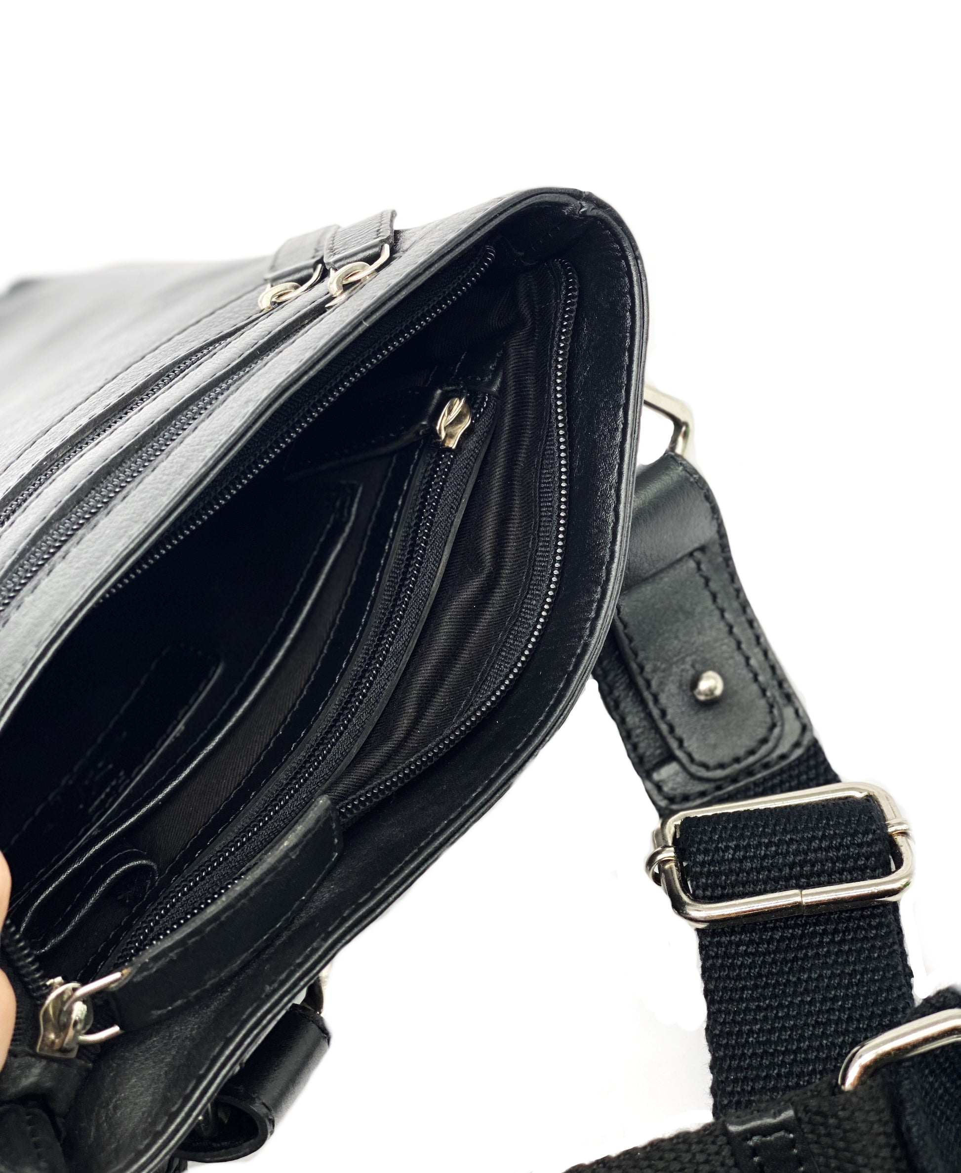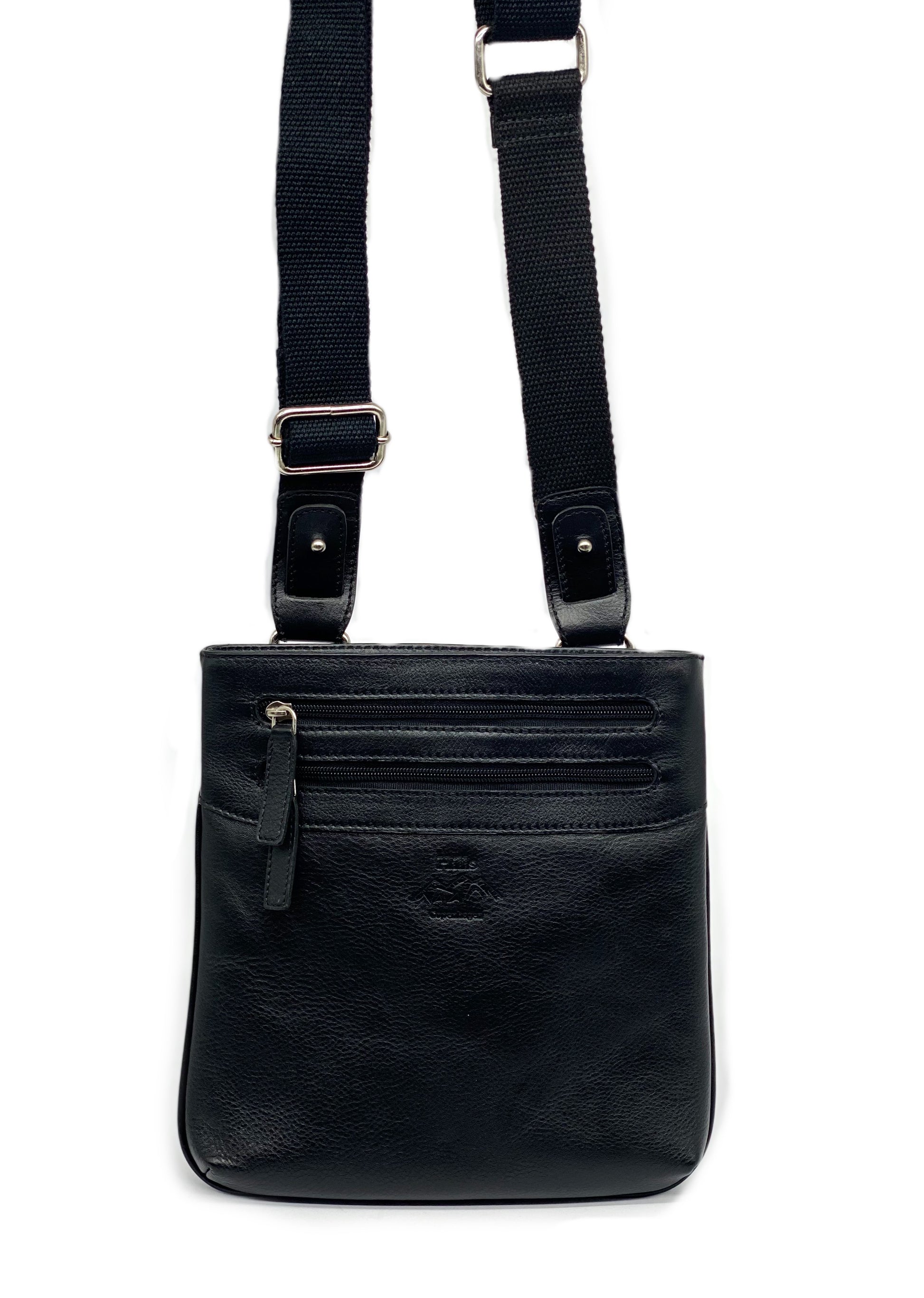 Denne crossbody er udført i kalveskin. Tasken kan bruges til hverdagen og ferien. Tasken har en lang skulderrem. Remmen er udført i canvas. Indvendigt finder man hhv. en lynlåslomme, samt en åbensidelomme. Tasken har to lynlåslommer foran, samt en bagved.