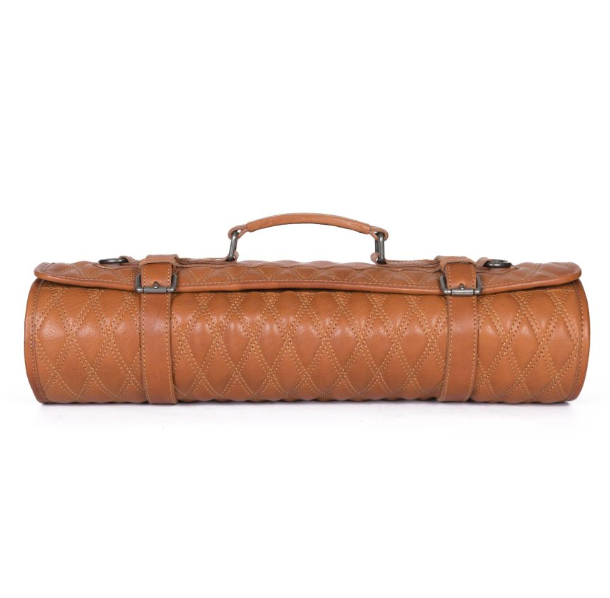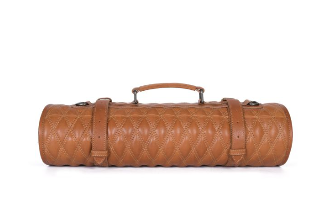 - Handcrafted from Premium Quality Leather and precision stitched by Skilled Craftsmen for durability and appeal. Twin Buckles Closure form a tight Roll along with a 2" Wide Webbed Shoulder Strap for ease in carrying the Knife Roll.