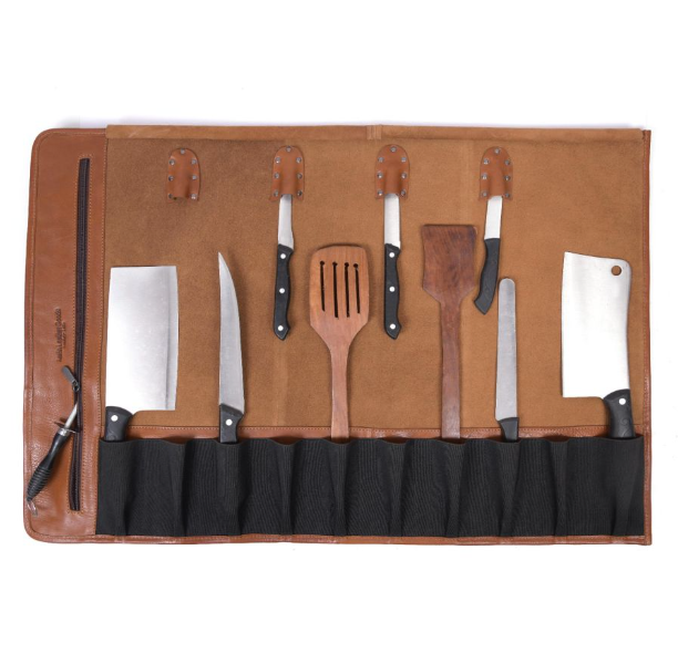- On the inside there is an all Suede Flap, underneath which are 10 Stretchable Knife Pockets on one side and 4 Leather Grooves on the other which can store up to 13 kitchen knives up to 18” Length along with other accessories.