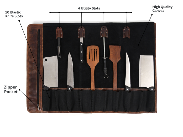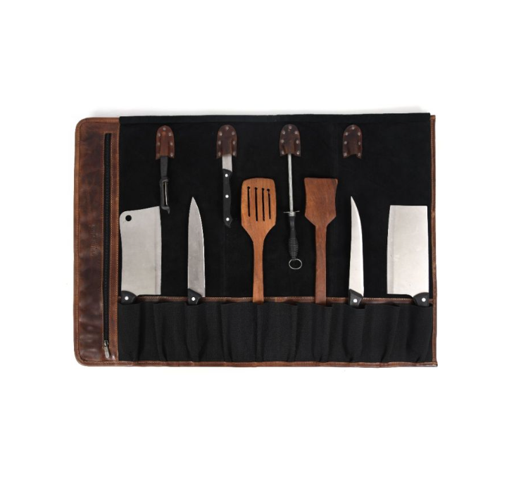 - The Interior also has a long Zippered compartment on the corner to keep intact other essential tools. The Knife Roll is apt for safety and is the go to safety kit for all those who are involved in the business of chopping, cutting & cooking.