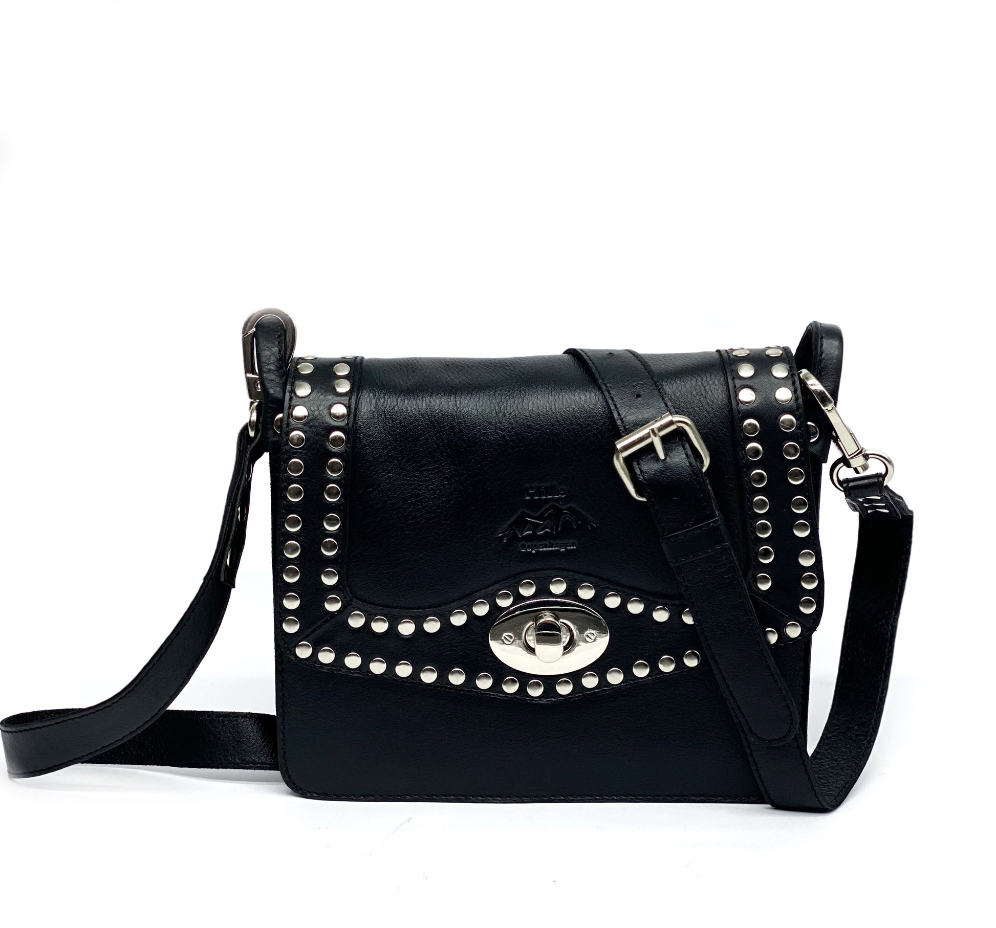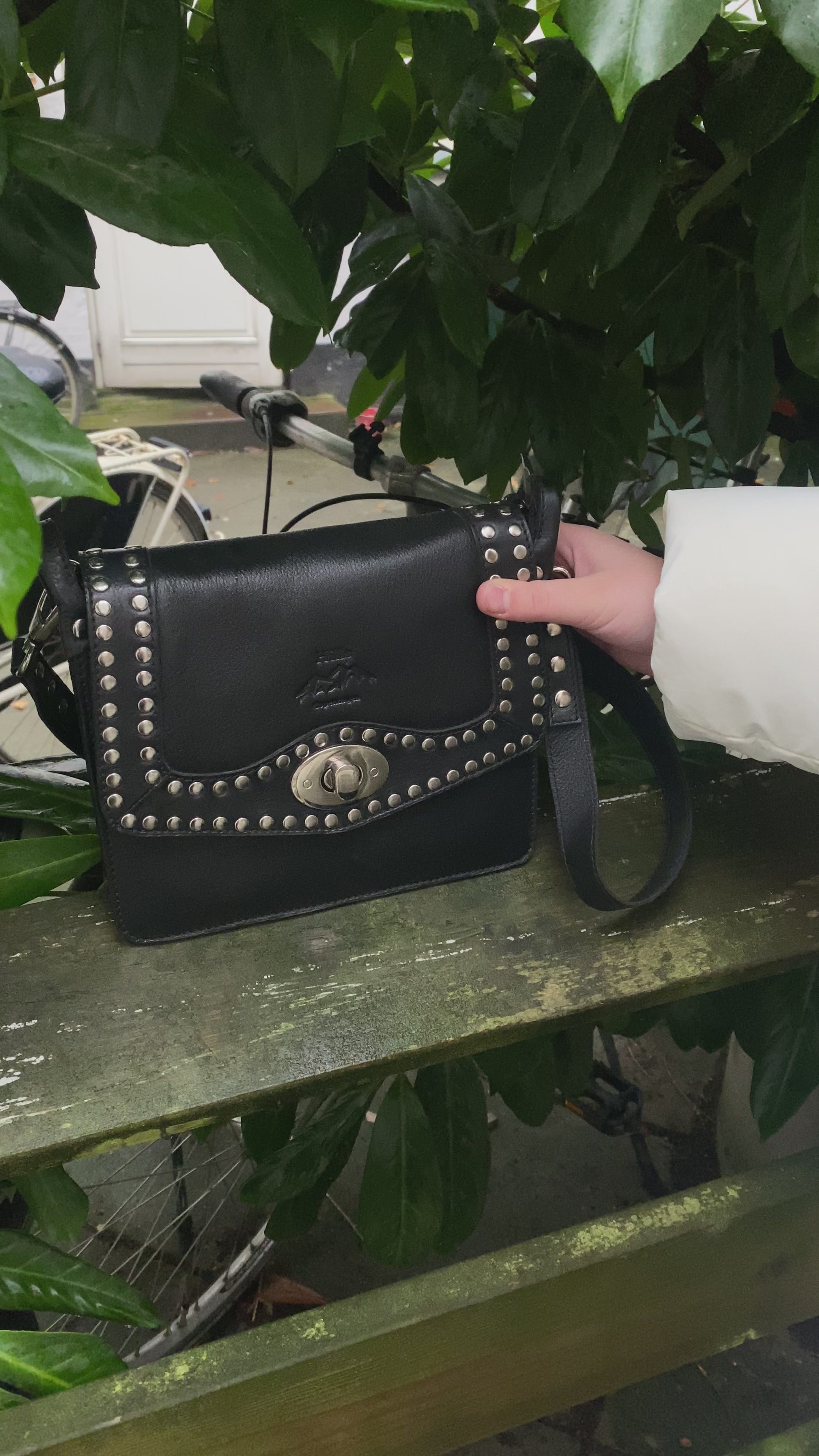 Dertil medfølger en lang justerbar skulderrem, som ligeledes er udført i ko-skind.